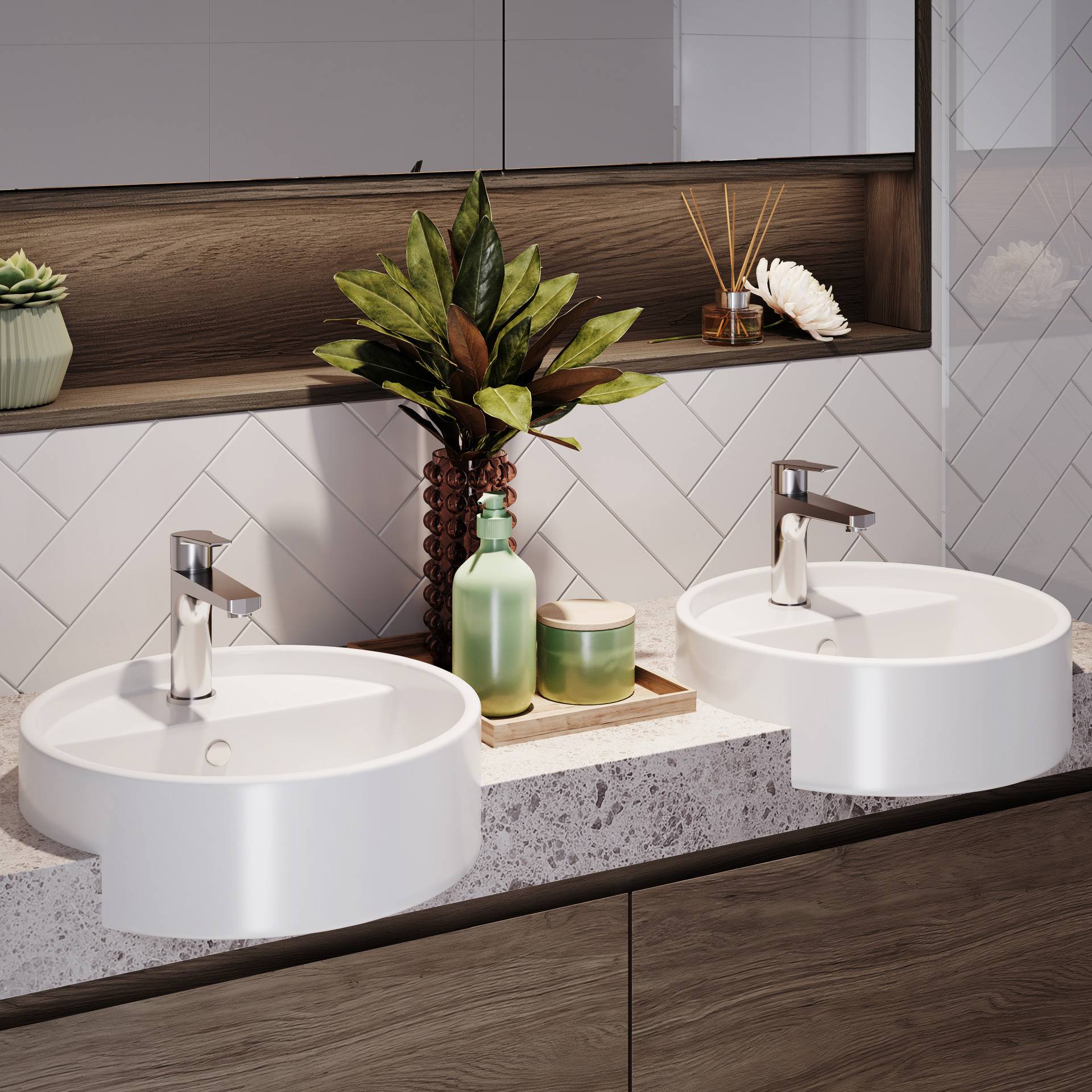 white herringbone patterned subway and floor-to-ceiling porcelain tiles in bathroom.