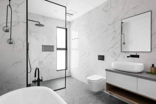 • stone look floor tiles and marble look wall tiles in bathroom.